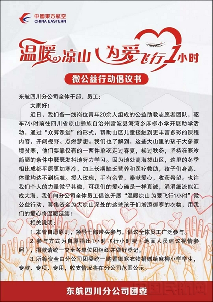为帮助这些大山里的孩子开阔眼界,鼓励他们努力学习、建设家乡,东航四川分公司的志愿者们又设计了“为爱飞行一小时”活动,飞行、客舱、空保等空勤部门的热心人各自主动捐出一小时的小时费,用于给孩子们助学、开阔视野,来自地面单位的志愿者此后也纷纷加入,热心相助。