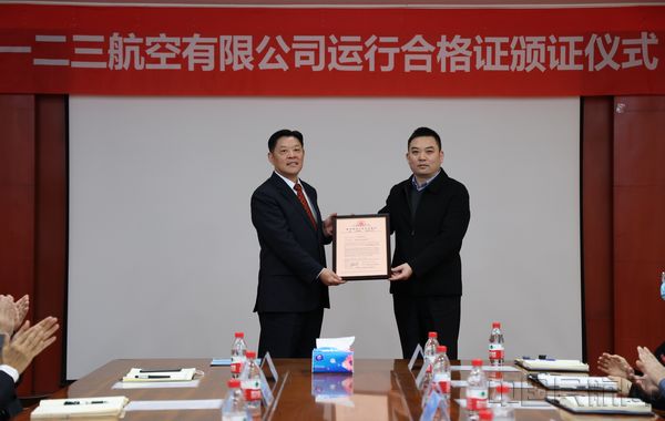 《中国民航报》、中国民航网 记者钱擘 通讯员蔡晓悠 报道:12月25日,一二三航空CCAR-121部运行合格审定颁证仪式在东航旗下一二三航空有限公司召开,民航华东管理局向一二三航空颁发了CCAR-121 部《航空承运人运行合格证》,双方签订了航空安全责任书。