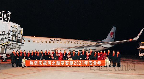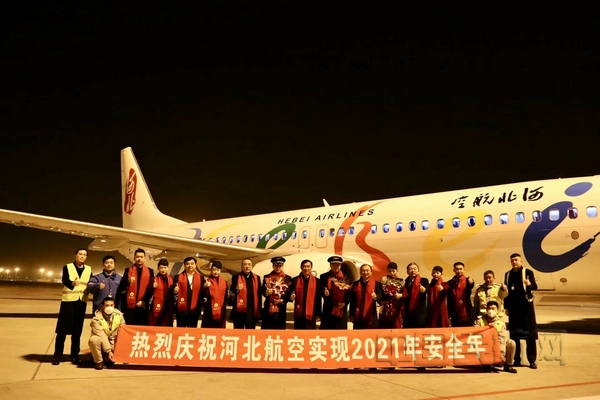 在石家庄正定国际机场,河北航空总经理陈洪波、党委书记吴建军及其他在家领导早早地等候在停机坪,迎接当晚在石家庄机场最后进港的航班。航班落地后,公司领导上前与机组亲切握手,并向机组及其他坚守岗位的地面保障人员致以新年的问候,共同庆祝公司顺利实现2021年安全年。