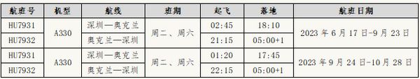 据悉,海南航空深圳—奥克兰航线计划每周二、周六各执行1个往返航班,采用空客A330客机执飞。去程计划北京时间02:45从深圳宝安国际机场起飞,当地时间18:10到达奥克兰国际机场,飞行时长11小时25分钟;返程计划当地时间21:15从奥克兰起飞,北京时间次日05:00到达深圳,飞行时长11小时45分钟。深圳始发直飞单程机票人民币2300元起,价格不含税费,具体价格以实际查询为准。