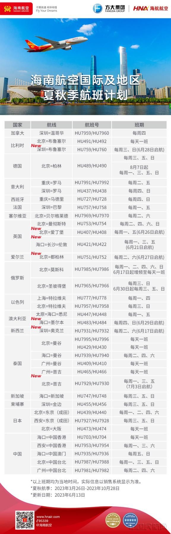 深圳作为海南航空重要的枢纽站点之一,国内、国际航线丰富。国际航线网络方面,目前海南航空从深圳始发的国际直飞航线将达到六条,除了已经运营的深圳至温哥华、金边、巴黎、罗马、奥克兰航线之外,还将于6月28日复航深圳—布鲁塞尔航线,届时海南航空将在华南区域搭建起辐射北美洲、欧洲、大洋洲、亚洲的国际航线网络。除此之外,海南航空在深圳拥有丰富的国内航线网络,包括深圳—北京、深圳—重庆、深圳—成都、深圳—杭州、深圳—南京、深圳—上海浦东、深圳—温州、深圳—西安、深圳—乌鲁木齐等共计30条航线、近60个航班,其中潍坊、阜阳、汉中、榆林、陇南等为独飞航线。丰富的国内航线极大地方便了旅客从全国各地经深圳中转搭乘国际航线。未来,海南航空将继续加大深圳枢纽站点建设,通过逐步丰富的境内外航线网络、优质的服务,为深圳乃至大湾区发展注入活力,搭建中外文化经济交流和经贸往来的空中桥梁。(编辑:张彤 校对:孙文瑾 审核:程凌)