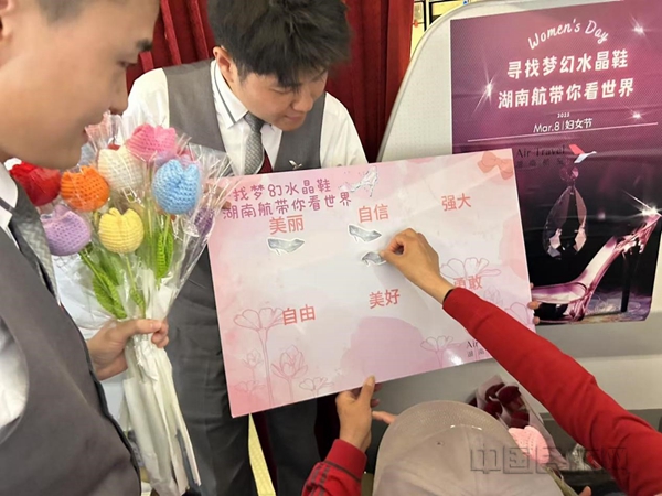 《中国民航报》、中国民航网 记者李佳为 通讯员麦寅虎、罗艳 报道:3月8日,为致敬每一位平凡而伟大的女性,湖南航空在A67777长沙—北京大兴、A67147昆明—无锡的航班上,特别策划了“寻找梦幻水晶鞋,湖南航空带你看世界”三八妇女节主题航班活动,为所有女性旅客们送上节日的祝福。