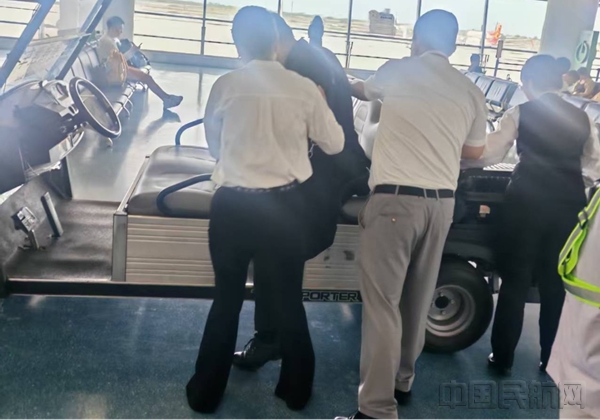 搀扶急症旅客乘坐候机楼摆渡车(长安航空供图)