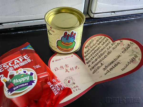 了解到苏女士这份跨越千里的心意后,乘务组全体成员深受感动。为了让这份爱与温暖在旅途中延续,乘务组立即行动起来,她们利用机上可用资源,发挥创意,为苏女士精心准备了一份独一无二的“生日大礼包”。同时,在心意卡上,全体机组人员郑重地写下了对苏妈妈最真挚的生日祝福。