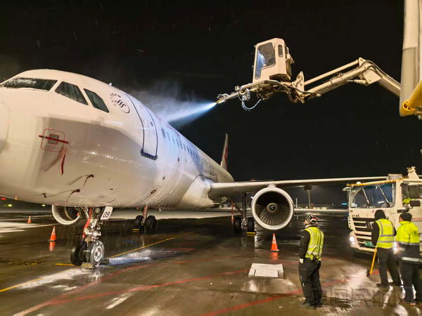 东航甘肃分公司全程密切跟踪天气动态,做到提前部署、靠前准备,全面加强设备巡检维护与应急物资储备,保障除冰液供应充足、各类保障设备工况良好。14日凌晨,航线维修人员顶风冒雪迅速抵达机坪,即刻开展飞机除冰作业。大家熟练操控除冰设备,细致清理机身表面积雪,确保飞机表面洁净无残留、完全符合适航标准。