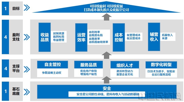 方案系统总结了江西航空战略转型1.0阶段的实践经验,结合民航大众化发展趋势,提出了“1441”大众化航司商业模式——即筑牢安全基石,夯实自主管控、服务品质、组织人才、数字化转型四大支撑平台,做强收益品质、运营效率、成本控制、辅营收入四大盈利支柱,最终实现可持续盈利、可持续发展,打造成本领先的大众化航空公司。方案明确了公司从转型1.0向2.0阶段过渡的路径,在航线网络优化、成本管控、辅营增收、数字化赋能等方面提出了具体行动指引。