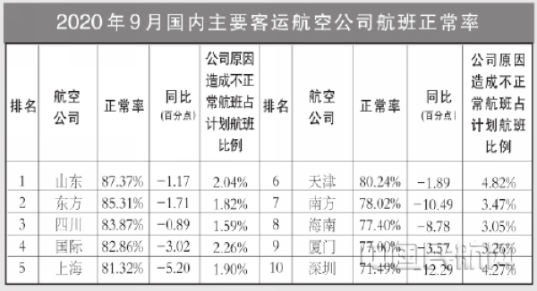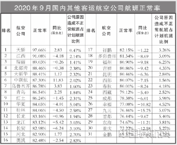 国内客运航空公司按照2019年日均执行航班架次划分,日均执行航班在300架次(含)以上的10家航空公司为国内主要客运航空公司,日均执行航班在300架次以下的为国内其他客运航空公司。2020年9月国内客运航空公司平均航班正常率81.06%,同比提高2.95个百分点。
