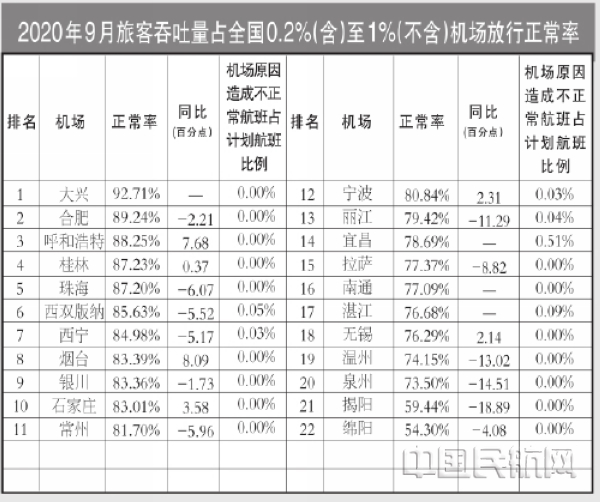国内主要机场按照2018年旅客吞吐量划分,分为旅客吞吐量占全国1%(含)以上机场及0.2%(含)至1%(不含)机场。2020年9月国内主要机场平均放行正常率84.68%,同比提高2.53个百分点。