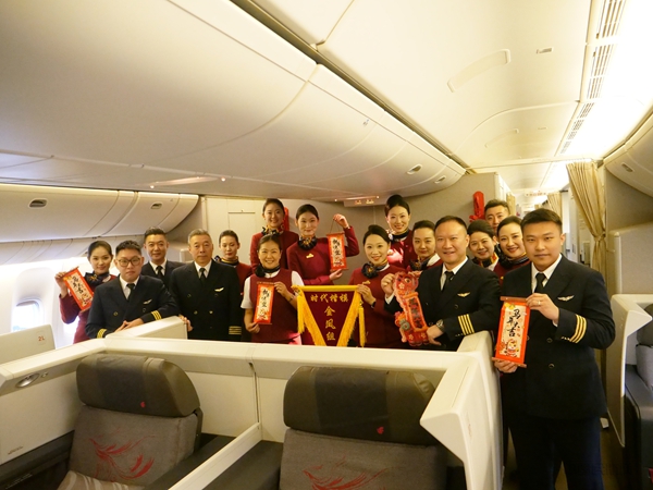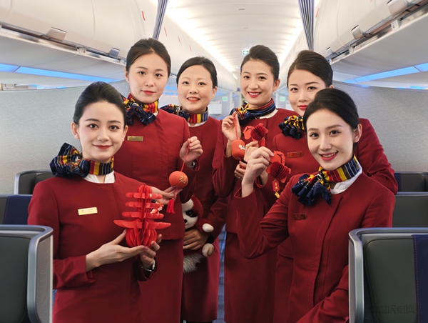 从上海浦东飞往新加坡的国航CA825航班以福字、中国结、缤纷新春挂饰增添年味,并推出妙趣横生的团扇拓印活动,旅客亲手拓下美好新春祝愿。