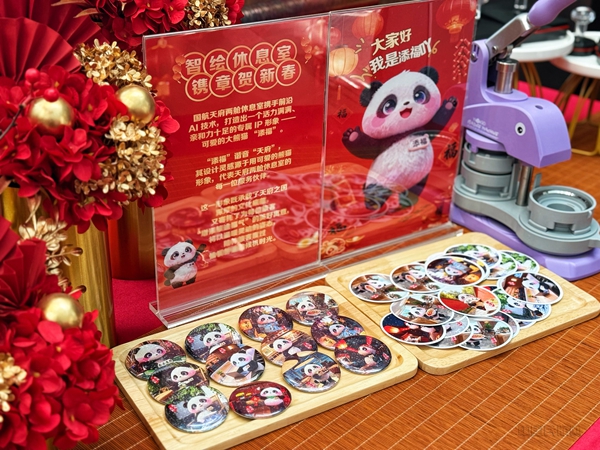 成都天府国际机场推出“智绘休息室 镌章贺新春”活动,邀请高端旅客体验DIY天府专属吧唧,赠送手账本印专属印章,并组织新年年画拓印、年夜饭品尝等活动。