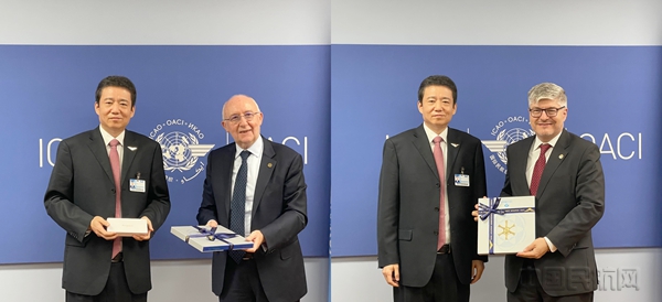 民航局副局长崔晓峰向国际民航组织理事会主席夏基塔诺、国际民航组织秘书长萨拉萨尔赠送礼物。(叶绿叶/摄)