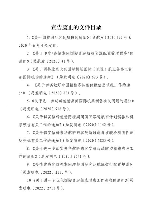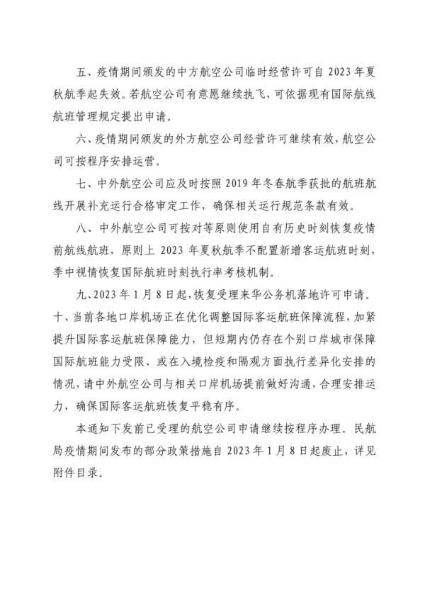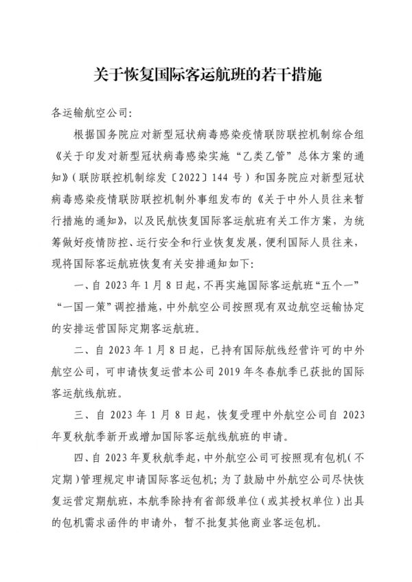 2022年12月28日,民航局下发通知,发布《恢复国际客运航班的若干措施》(以下简称措施)。措施包括“自2023年1月8日起,不再实施国际客运航班‘五个一’‘一国一策’调控措施”等十项具体内容;同时宣布自2023年1月8日起废止疫情期间发布的部分政策措施。