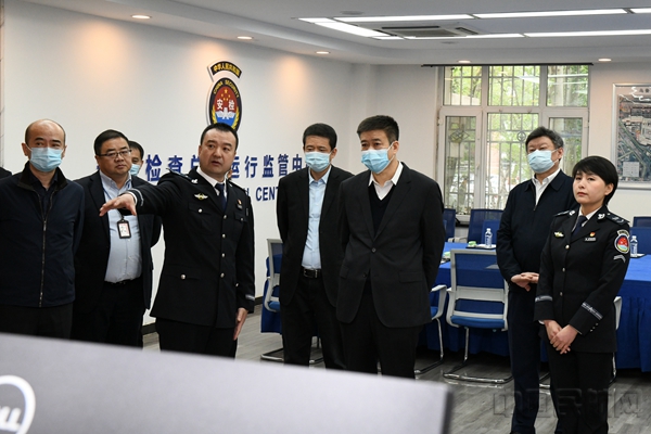宋志勇一行在乌鲁木齐机场SOC调研了解安检指挥中心安检集中控制管理情况和空防安全情况