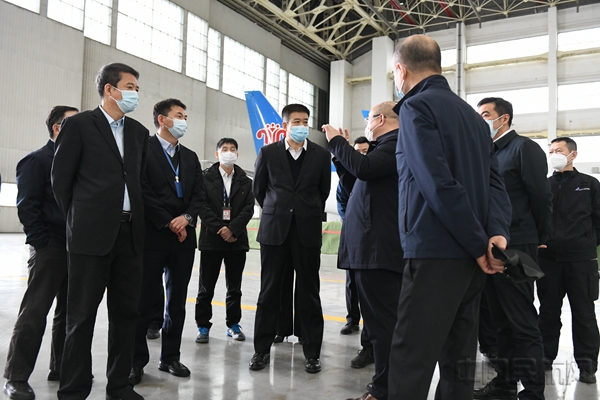 宋志勇一行在南航工程技术分公司新疆基地飞机机库了解机务维修工作