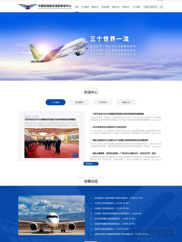 门户网站集成设置了“中心概况”“新闻中心”“政策法规”“党建文化”“专题专栏”“人才招聘”等6大版块:“中心概况”版块全方位展示适航审定中心系统主要职责、组织架构以及近年来取得的重要成果;“新闻中心”版块汇聚适航审定中心系统重要新闻信息动态、国内外民用航空产品型号适航审定工作进展和行业动态;“政策法规”版块集成展示了国内外适航审定有关规章标准等,多形式展示审定中心系统精神风貌、工作状态。