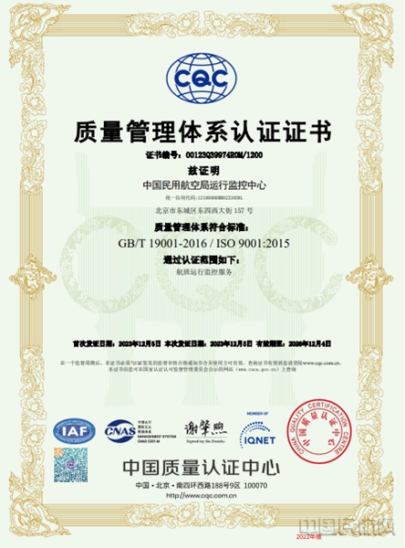 《中国民航报》、中国民航网 记者潘瑾瑜、通讯员刘锋锋 报道:日前,民航局运行监控中心通过由中国质量认证中心开展的质量管理体系认证外审,获得ISO9001质量管理体系认证证书,认证范围为航班运行监控服务。
