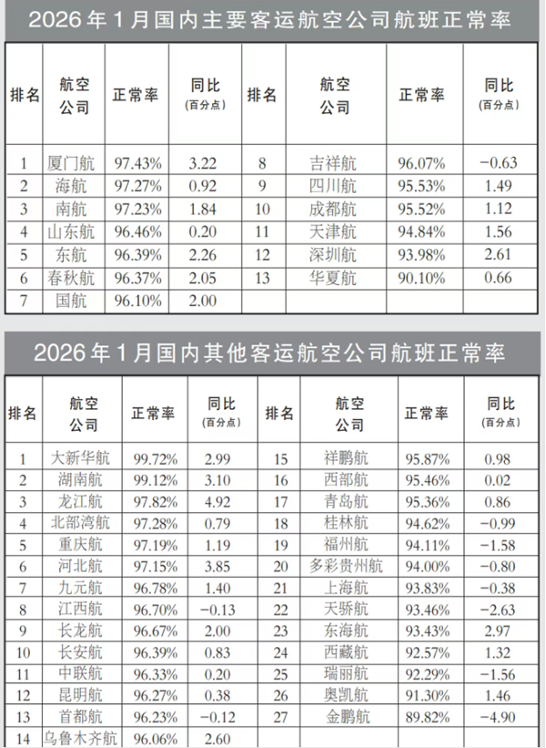 2025年执行的航段班次占国内客运航空公司总航段班次2%(含)以上的航空公司为国内主要客运航空公司。执行的航段班次占国内客运航空公司总航段班次2%以下的航空公司为国内其他客运航空公司。2026年1月国内客运航空公司平均航班正常率95.95%,同比上升1.52个百分点。