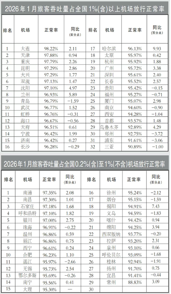 国内主要机场按照2024年旅客吞吐量划分,分为旅客吞吐量占全国1%(含)以上机场及0.2%(含)至1%(不含)机场。2026年1月国内主要机场平均放行正常率95.53%,同比上升1.17个百分点。