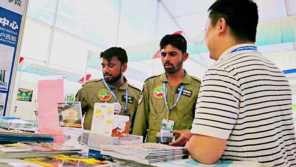巴基斯坦飞行员在出版社展台索要英文版书籍(赵晓兵/摄)