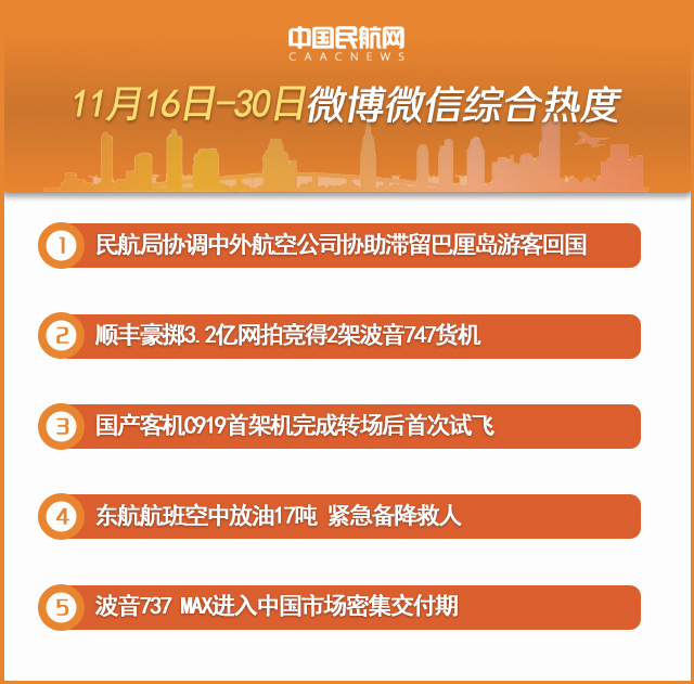 中国民航报社舆情分析中心权威发布半月舆情报告,报告对2017年11月份下半月民航热点话题进行了排行,筛选出十大热点新闻。分别为民航局协调中外航空公司协助滞留巴厘岛游客回国、顺丰豪掷3.2亿网拍竞得2架波音747货机、国产客机C919首架机完成转场后首次试飞、东航航班空中放油紧急备降救人、海南航空执飞国内首班生物航煤跨洋航班等。
