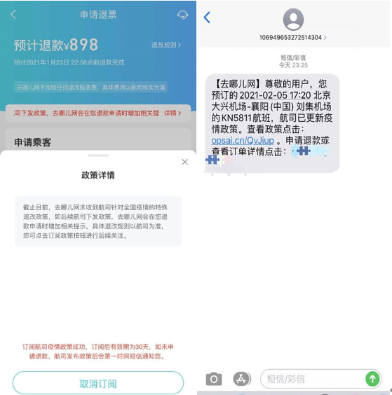 去哪儿旅行APP的订阅功能将随时为旅客推送政策情况,方便符合政策的订单自助办理