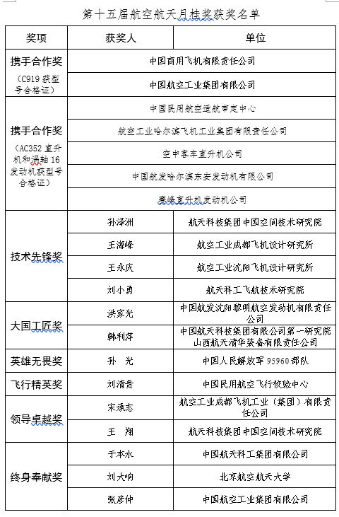 天问一号火星探测器总设计师孙泽洲、航空工业成都所总设计师王海峰、航空工业沈阳所总设计师王永庆、航天科工三院31所副所长刘小勇获技术先锋奖;中国航发黎明数控车工洪家光、航天科技一院数控铣工韩利萍获大国工匠奖;空军某部试飞员孙光被授予英雄无畏奖;中国民航飞行校验中心主任刘清贵获飞行精英奖;航天科技集团五院空间站系统总指挥王翔、航空工业成飞董事长宋承志获领导卓越奖;张彦仲、于本水、刘大响三位院士获终身奉献奖。