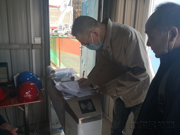 走进施工现场大门口,映入眼帘的是悬挂于工地外围墙上“戴口罩、测体温、少聚集、勤洗手、勤消毒、勤通风”,“早发现、早报告、早诊断、早隔离、早治疗”等醒目标语。随后,在施工方现场负责人的带领下,我们通过了唯一的实名制通道,并进行签名登记和体温测量,戴上安全帽后,进入施工现场。