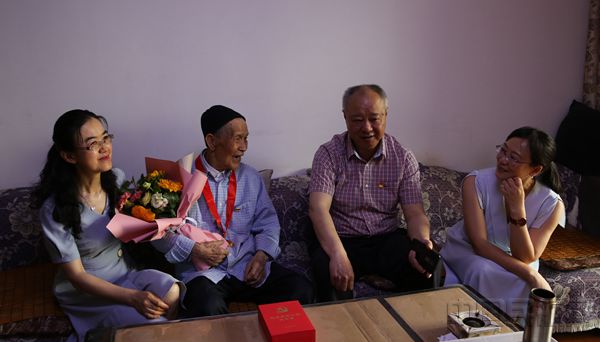 在“两航起义”人员陈鸿才家中,西南空管局党委书记覃琥诚为这位已101岁高龄、光荣在党71年的老党员颁发了纪念章,并代表西南空管局党委向他致以节日的慰问,祝老人身体健康。抚摸着沉甸甸的纪念章,陈鸿才心情激动地连声说“好”,对党组织的关心表示感谢。