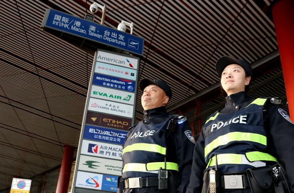 首都机场公安分局机关支援警力在三号航站楼外驻点