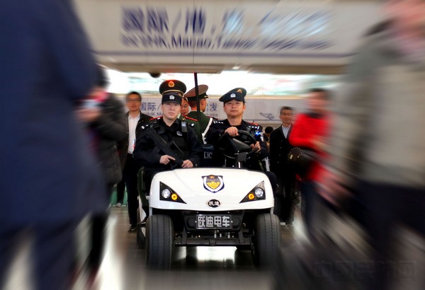 首都机场公安分局与武警组成的联勤联动巡逻警力在二号航站楼内巡逻