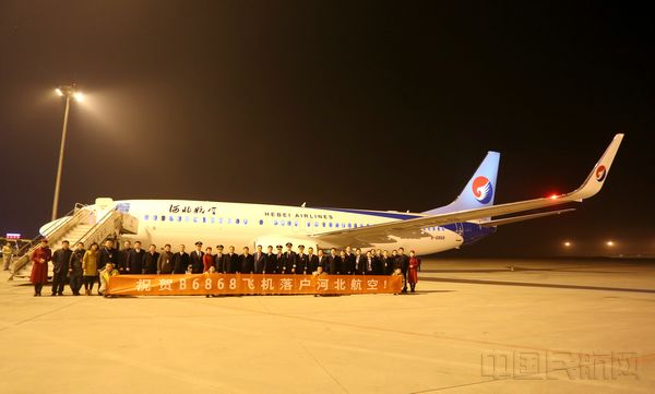 中国民航网 通讯员张毓、玉洋 报道:1月24日18:45,一架注册号为B-6868的全新波音737-800型客机,由美国西雅图顺利飞抵石家庄机场,石家庄机场迎来了2017年第一架驻场飞机,河北航空驻场运力规模达到18架,石家庄机场驻场飞机达27架。