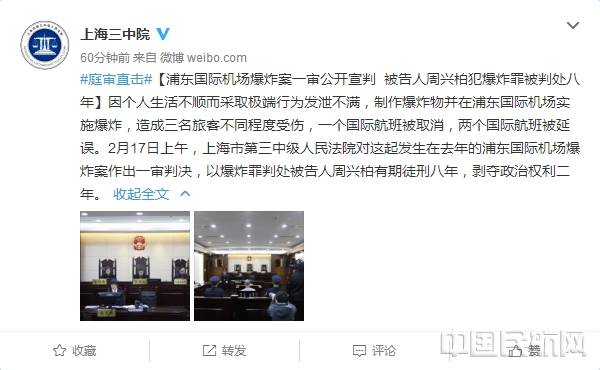 《中国民航报》、中国民航网 记者马欢 报道:据上海市第三中级人民法院官方微博消息,2月17日上午浦东机场爆炸案在上海市第三中级人民法院公开宣判,被告人周兴柏因个人生活不顺而采取极端行为发泄不满,制作爆炸物并在浦东国际机场实施爆炸,造成三名旅客不同程度受伤,一个国际航班被取消,两个国际航班被延误。作案后,周兴柏在案发现场持刀割颈自杀未遂,被公安人员当场抓获。