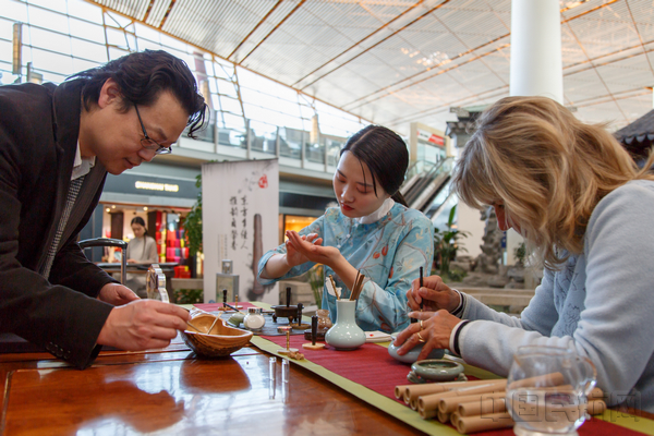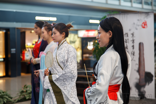 香,凝神静气,给人以全身心的清净,琴,厚重优雅,用音律诉说切切衷肠。伴着温润的古琴声,手捧清雅的香丸,袭一身华美的汉服,于山水亭台间,放松自我,修养生命。此次活动,通过传统古琴弹奏、香道展示、汉服礼仪,从视、听、嗅多维度给国内外旅客带来了一场传统文化盛宴。不仅如此,现场旅客还可亲自参与活动,通过手搓香丸、绘制团扇、学习古琴指法等让传统文化在趣味间耳濡目染,浸润身心,进一步丰富了旅客候机体验,提升了首都机场服务品质。