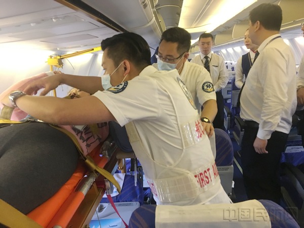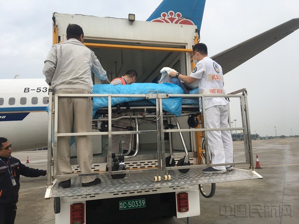 上午08:45分,机场救护车直接护送伤者直达停机坪,利用残疾升降平台,由飞机后舱门安全转运到机上固定担架。