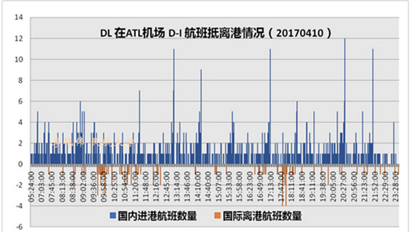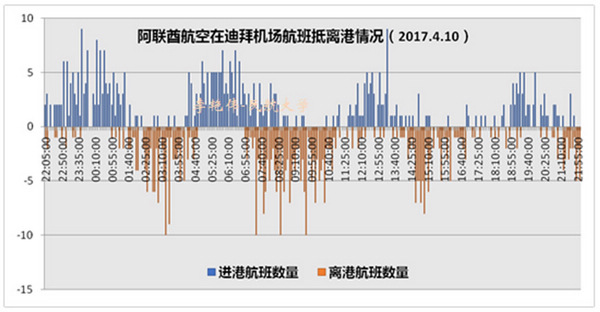 下图为阿联酋航空在迪拜机场的航班抵离港情况。迪拜机场为24小时开放的机场,从图中可以看出,迪拜机场一天有四个非常明显的航班波。晚上10点到第二天上午11点是两个连续的高峰时段。