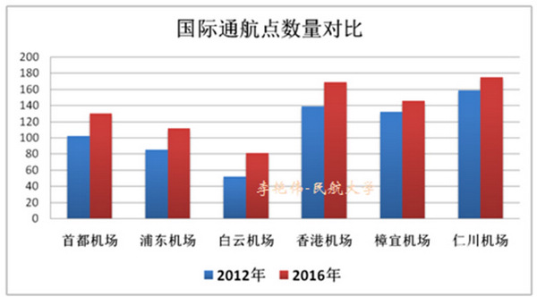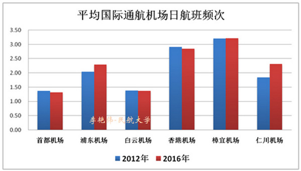 在航线网络密度方面,上海浦东机场国际通航机场日航班频次从2012年至2016年有所改善;首都机场与白云机场都略有下降。首都机场与周边国家(或地区)的国际枢纽机场比,国际通航机场日均航班频次较低,在航线网络厚度方面的竞争性有待进一步提升。