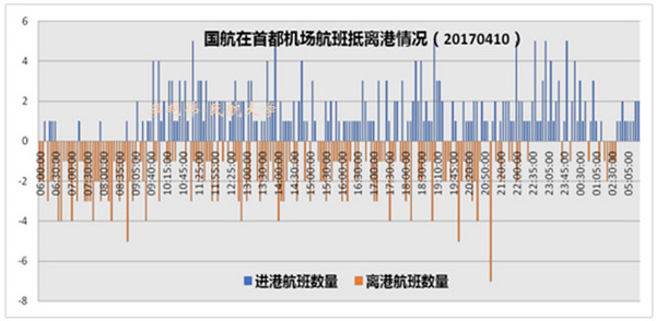 国航是首都机场最重要的基地航空航空公司,其在首都机场航班抵离港情况如下图所示。从图中可以看出,6:00至9:30是早高峰,航班集中离港;21:00至次日凌晨1:00是晚高峰,航班集中进港。凌晨1:00-5:30进出港航班主要为国际航班。国航目前在首都机场航线网络主要以点对点式的航线网络运营模式为主。