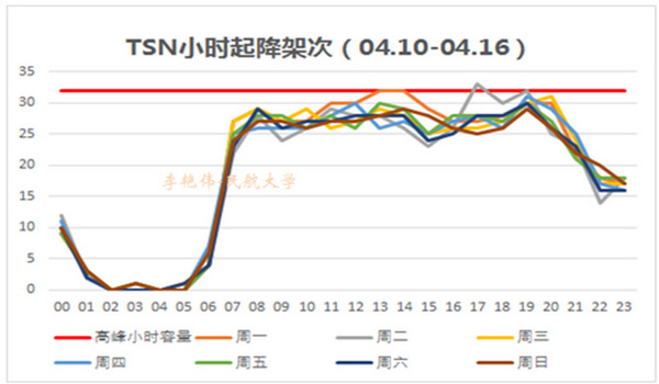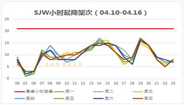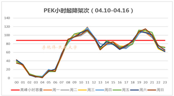 众所周知首都机场航班时刻资源一刻难求。习近平总书记在视察北京新机场时也指出,许多国家提出想要开通或增开到北京的航线,但我们目前条件有限。首都机场高峰小时容量为88架次,利用航班计划数据绘制出2017年4月10日-4月16日的起降架次分布情况,如下图所示。首都机场无论从空域与航班时刻,还是航站楼基础设施资源等方面,都已经超饱和运行。