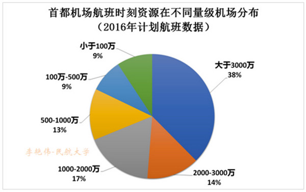 通过前述分析可以总结出首都机场国际航线网络的特征表现为:点多、面广、频次低。此种航线网络结构的形成有其历史原因。民航运输是典型的衍生服务产品,其受经济社会发展、人民收入水平、政府政策等多方面因素影响。在过去十几年中,我国经济社会总体发展速度较高,全国各地区经济也取得了长足的发展。随着经济社会总体发展水平的提高,在出行方式选择上,航空运输也越来越受到大众的青睐。一方面,各地区政府在新机场建成通航、已有机场航线网络结构优化时,都希望能够开通直达北京的航班(业内称之为“红旗效应”);另一方面,一些三四五六七八线城市的机场只要建成通航、或优化调整航线结构时候,也都希望能够连通首都机场这样的大型国际枢纽。并且,由于民航运输业准公共基础设施性质,民航局也陆续出台了关于支持红色老区发展、支持支线机场发展等相关政策。航空公司在政府政策鼓励、税费补贴、机场积极营销下,也是乐于开通这些运输规模较小的机场至首都机场的航线航班。利用2016年计划航班数据,绘制出首都机场航班时刻资源在不同量级机场分布如下图所示。
