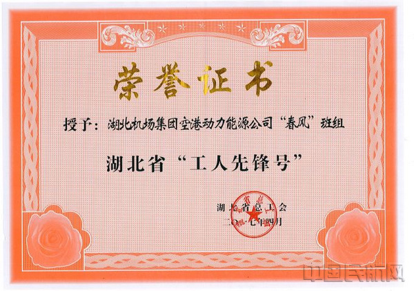 湖北空港动力能源公司“春风”班组工人先锋号荣誉证书