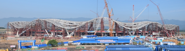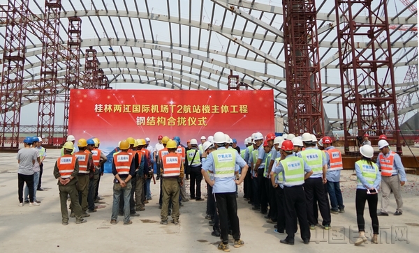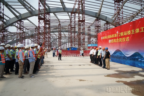 中国民航网 通讯员刘荣华 报道:5月31日上午10点30分左右,随着桂林机场扩建工程指挥部陈衡指挥长“按计划进行”的一声令下,桂林两江国际机场航站楼及站坪配套设施扩建工程(简称“桂林机场扩建工程”)T2航站楼主体钢结构最后一榀钢架缓缓吊入指定位置焊接安装,顺利完成合龙,比原计划提前15天。至此,桂林机场扩建工程T2航站楼“山水桂冠”的造型已经基本成型。
