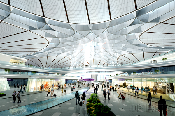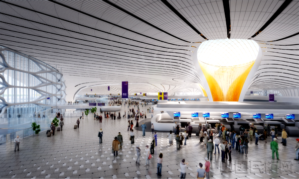 从新机场航站楼效果图上可以看到,新颖的中央放射五指廊构型为旅客构建了宽敞、明亮的空间。站在航站楼公共区域的中央浮岛之上,旷远恢宏的中心峡谷、烁采流光的祥云屋顶、力擎四方的金色C型柱等三大标志性建筑将一览无余。创新科技与航站楼水系、景观、公共艺术设计融合共生,提升了航站楼空间视觉品质。