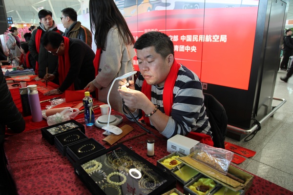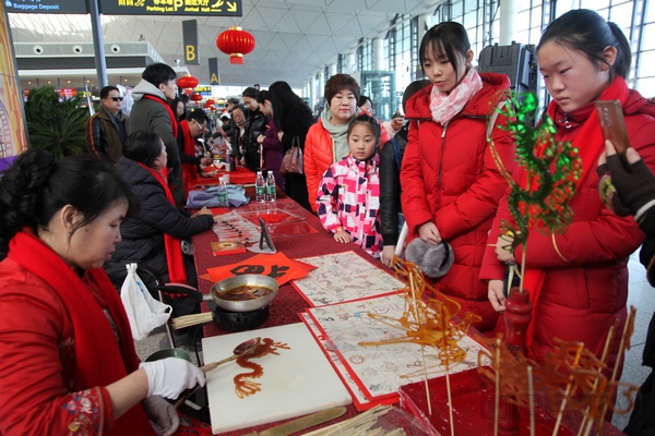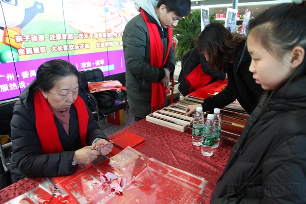 “我们的节日—春节”主题活动分为文化表演、抽奖互动、非遗展示和服务宣言四部分。活动中,沈阳机场为广大旅客带来了欢乐且充满年味儿的音乐盛宴,呈现了精彩纷呈的礼仪操和歌舞表演,青年书法家们笔走龙蛇,倾情挥毫,创作出近千幅春联,为旅客送上一份饱含“人情味”的小年礼物。最具“新年味”的一系列中国传统民俗文化大餐,有面塑、糖画、雕刻、剪纸等非遗文化表演,受到了旅客朋友的热烈欢迎,也为沈阳机场增添了浓浓的年味儿。“太贴心了,正好回家过年,带上这样一份礼物,别有一番风味”。一位旅客一进航站楼便感到浓郁的节日气息,面对机场工作人员甜美而真诚的微笑,原本急切的心情也变得轻松愉快起来。