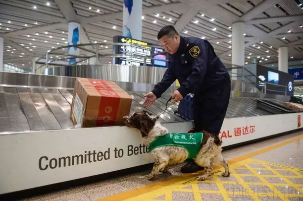 出入境检验检疫人员身着海关制服、佩戴海关臂章牵着检疫犬对行李进行搜查。