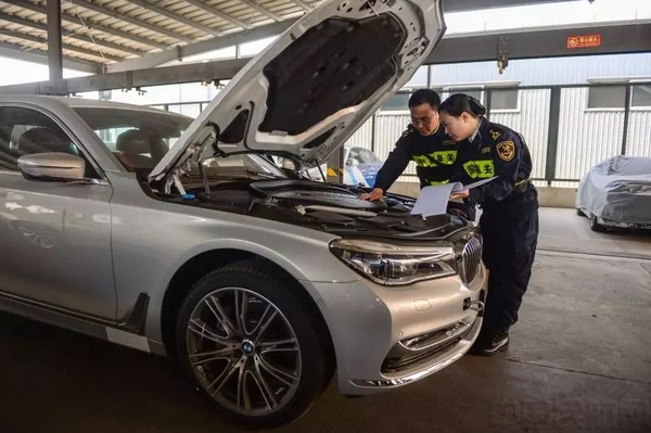 海关和检验检疫业务优化整合,海关工作人员正在对进口整车查验。