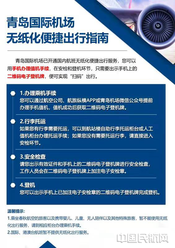 需要特别提醒旅客的是,目前,搭乘春秋航空航班从青岛出港的旅客,携带婴儿或其他特殊旅客以及乘坐国际、地区航班的旅客,需至相应柜台办理纸质登机牌。