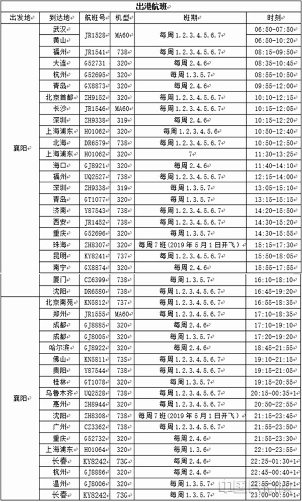 中国民航网 通讯员黄靖清 报道:从3月31日起,襄阳机场将全面执行2019年夏航季航班计划。