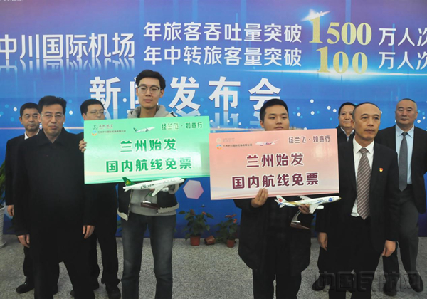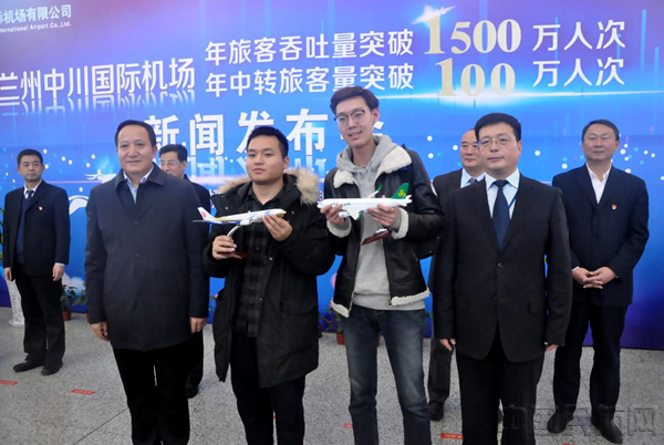 民航西北地区管理局公安局局长马新安和民航甘肃安全监督管理局副局长王孝共同为兰州中川国际机场第1500万位、第100万位中转幸运旅客赠送飞机模型;甘肃省民航机场集团党委书记、董事长席必泽和党委副书记、总经理胡红斌共同为兰州中川国际机场第1500万位、第100万位中转幸运旅客赠送机票。