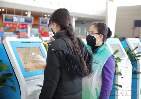 通过温度检测后,“青青侠”志愿者服务队的志愿者会主动引导旅客优先选用自助设备办理乘机手续,以加快办理速度,减少等待时间。