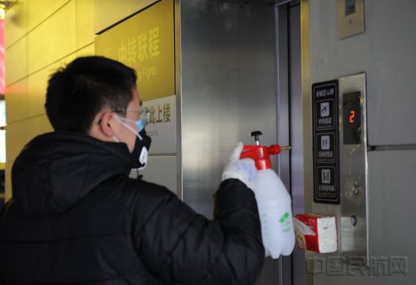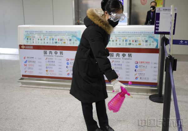 机场也为工作人员配备了消毒灭菌的产品,在人员流动的空隙,对公共区域加大消毒频次。